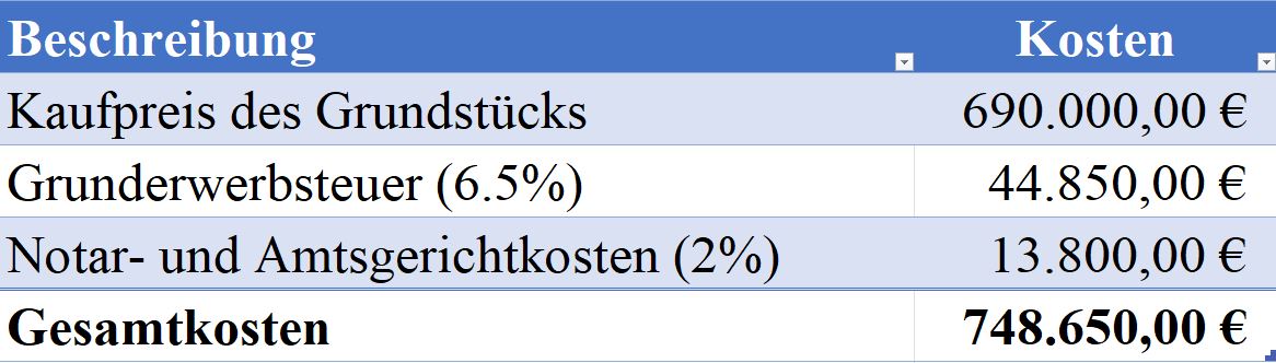 Die Gesamtinvestition für den Erwerb des Grundstücks setzt sich aus dem Kaufpreis und den Nebenkosten zusammen und beläuft sich daher auf 748.650 Euro (690.000 Euro + 58.650 Euro).
