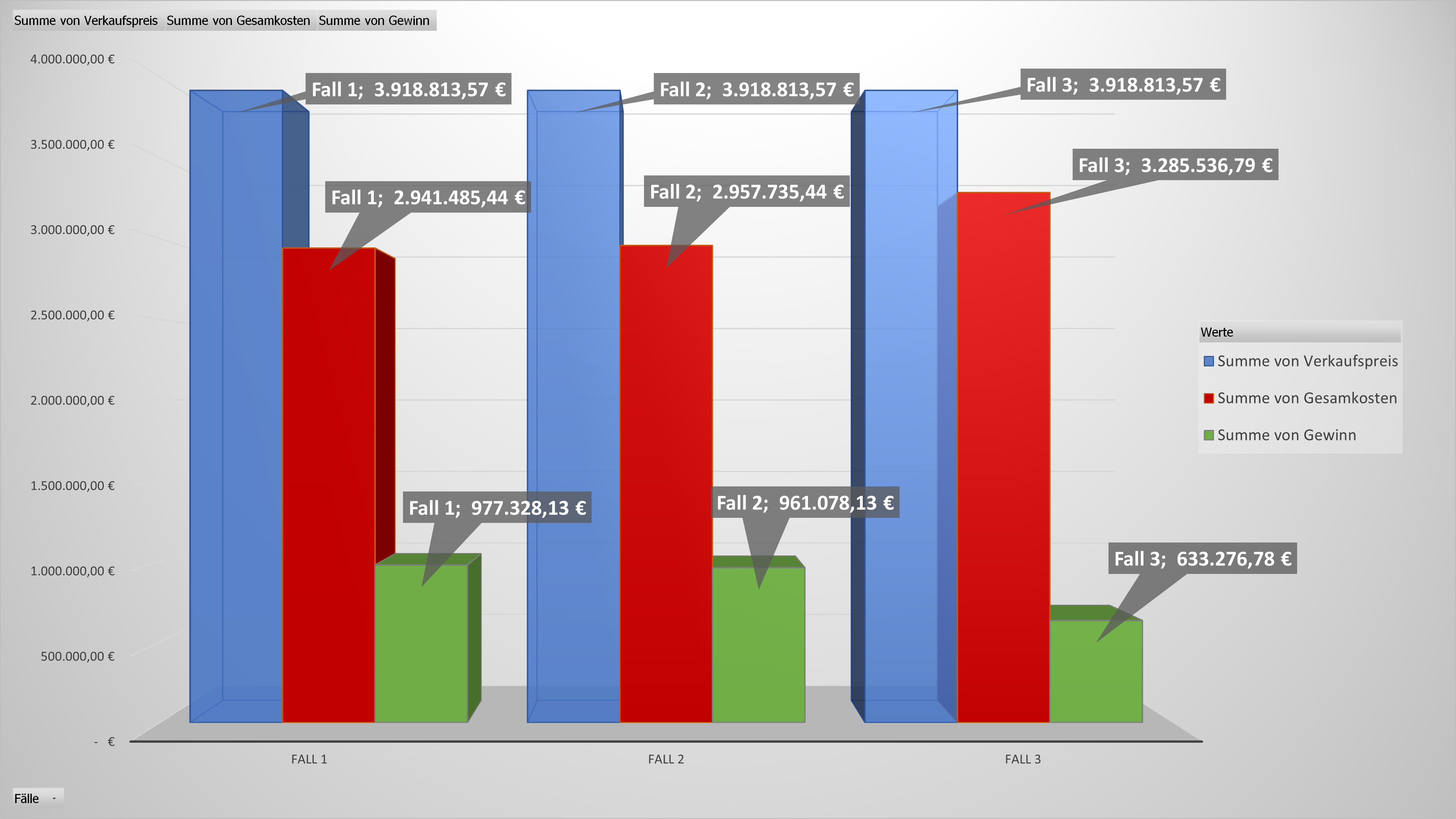 Fall 3 (Kosten +20%): Selbst bei einer erheblichen Kostensteigerung von 20% bleibt das Projekt profitabel, mit einem prognostizierten Gewinn vor Steuern von 633.276,78 Euro. Dies zeigt die Robustheit des Projekts gegenüber Kostenschwankungen.