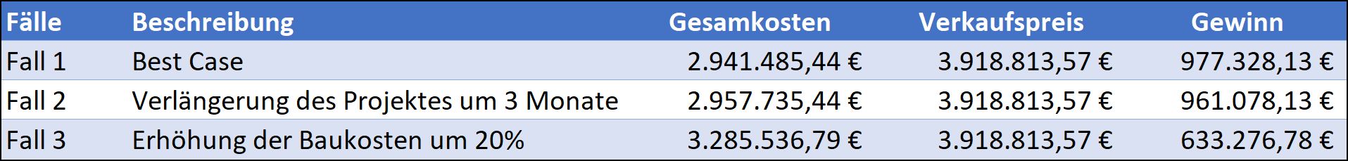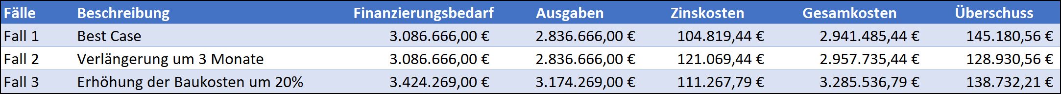 Fall 2 (Worst-Case): Sollten sich Verzögerungen in der Baugenehmigung ergeben, führt dies zu einem leicht reduzierten Gewinn von 961.078,13 Euro vor Steuern. Trotz der höheren Zinskosten bleibt das Projekt rentabel.