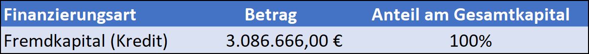Da kein Eigenkapital eingesetzt wird, erfolgt die komplette Finanzierung über Fremdkapital:
